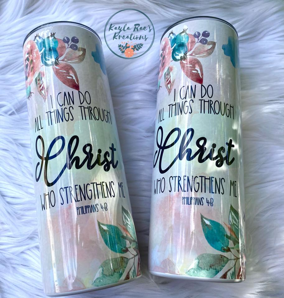 This is a 20 oz skinny stainless steel double wall tumbler with a floral design. A clear plastic straw is included.